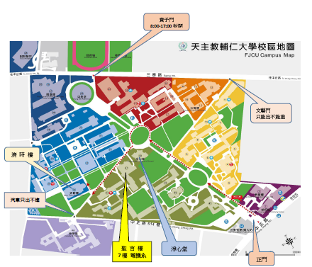 (1)12月6日(六)車輛進入校園免收費,當日因中美堂舉辦活動,上午8點至10點30分,貴子門車輛管制不得進出,10點30分後再開放貴子門車輛進出。車輛請由中正路前校大門進、出,並建議車輛請依以下本校校園平面圖紅色路線圖箭頭指示到達濟時樓會場。