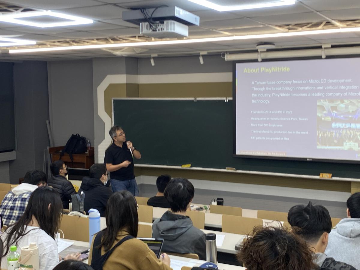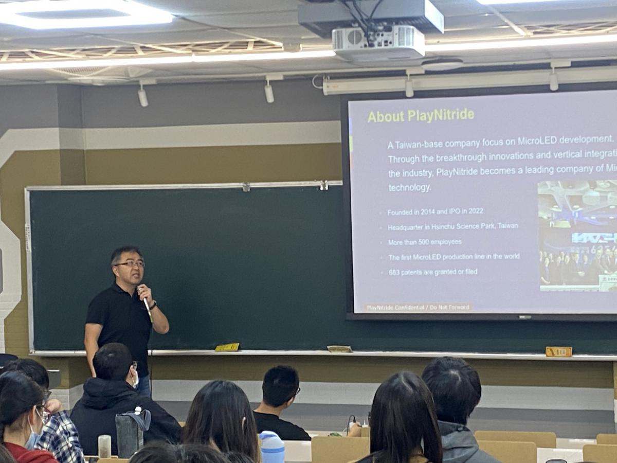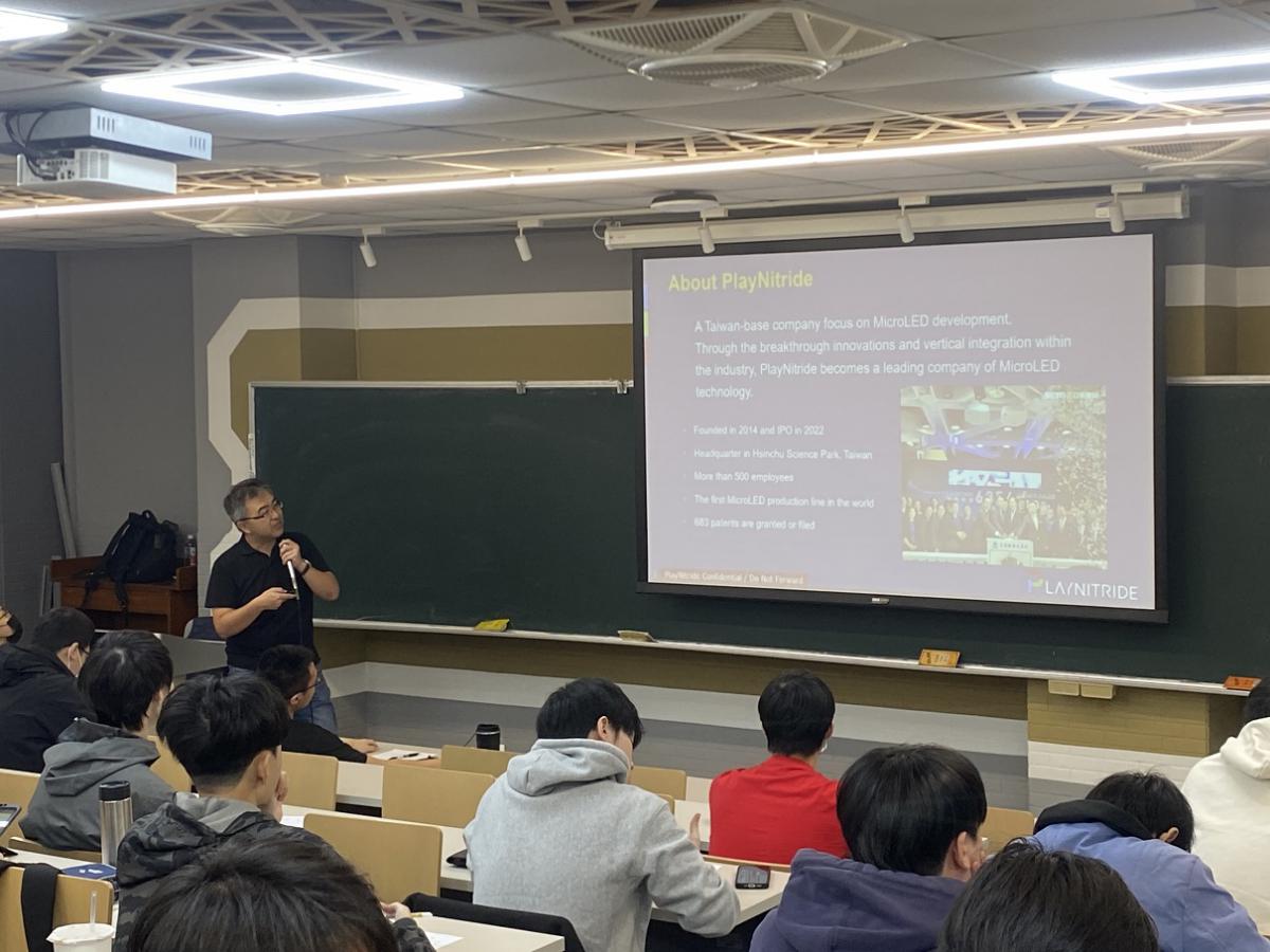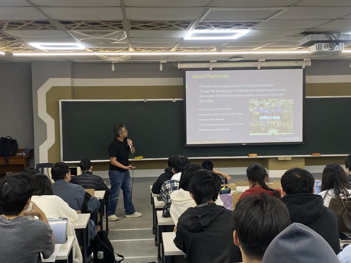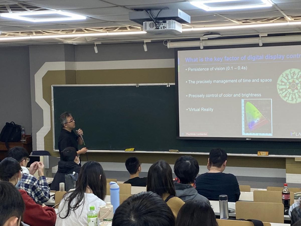 這次非常榮幸能邀請到廖冠詠學長來為我們演講,讓我們對Micro LED的發展與未來趨勢有了更完整的理解。講者首先從視覺暫留(0.1–0.45 秒)談起,指出顯示技術的核心其實就是精準控制時間、空間、亮度與色彩,這也是推動 VR、AR 等沉浸式顯示的基礎。接著回顧顯示器從 CRT、PDP、投影式顯示、LCD、OLED 到最新 Micro LED 的世代演進,並分析各類技術的優缺點,例如 LCD 耗電高、OLED 可能出現烙印,而 Micro LED 則兼具高亮度、高對比、超快反應速度以及可撓曲等優勢。
